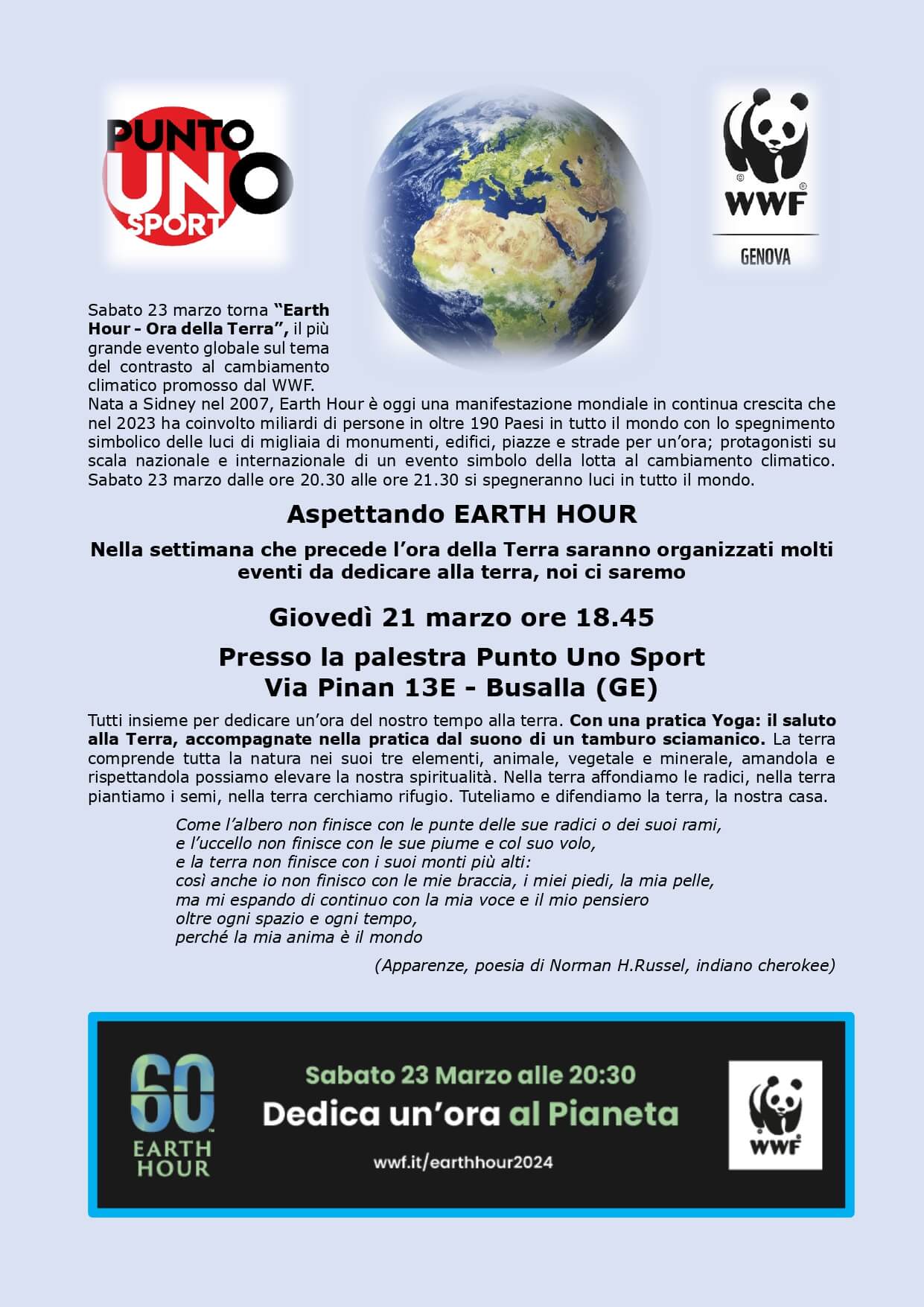 Presso la palestra Punto UNO SPORT si terrà una lezione di Yoga rivolta all’Ora della Terra con una pratica dedicata: il saluto alla terra. Breve introduzione all’evento e poi la pratica che sarà accompagnata dal suono di un tamburo sciamanico.