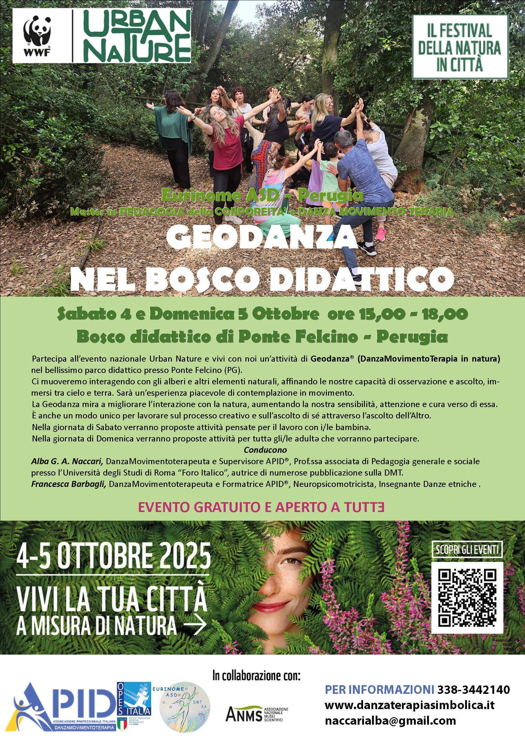 Partecipa all’evento nazionale Urban Nature e vivi con noi un’attività di Geodanza® (DanzaMovimentoTerapia in natura) nel bellissimo parco didattico presso Ponte Felcino (PG). Ci muoveremo interagendo con gli alberi e altri elementi naturali, affinando le nostre capacità di osservazione e ascolto, immersi tra cielo e terra. Sarà un’esperienza piacevole di contemplazione in movimento. La Geodanza mira a migliorare l’interazione con la natura, aumentando la nostra sensibilità, attenzione e cura verso di essa.