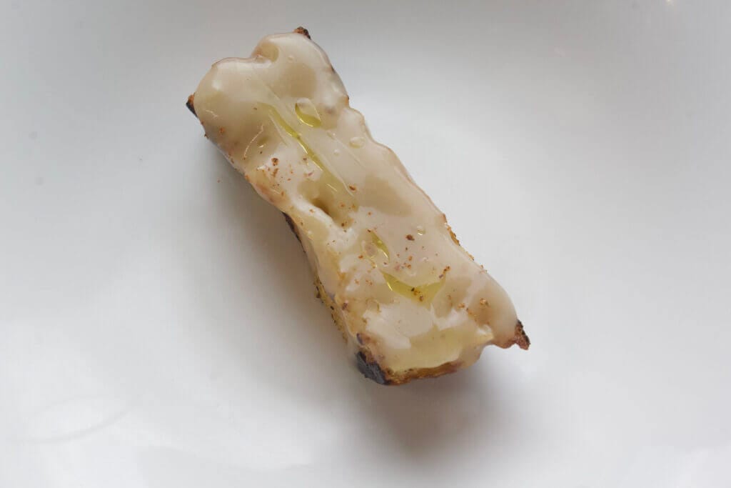 Tagliare la fetta a metà e cospargere la mollica con acqua di finocchio, riduzione di vino, salsa pane calda. Completare con un filo d’olio e una macinata di pepe.